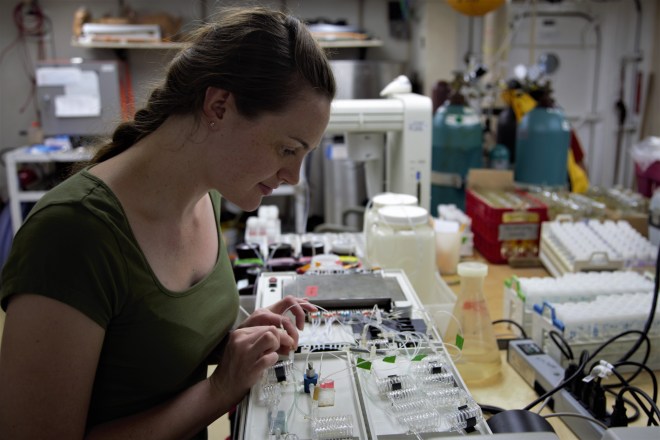 Previous ImageNext Image erin tends her samples Scripps ODF Chemistry Technician Erin Hunt tends to her chemistry in the one of the labs aboard the Roger Revelle.