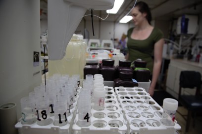 Tubes awaiting samples in the hydro-lab of the Roger Revelle. Scripps ODF Chemistry Technician Erin hunt monitors her samples in the background.