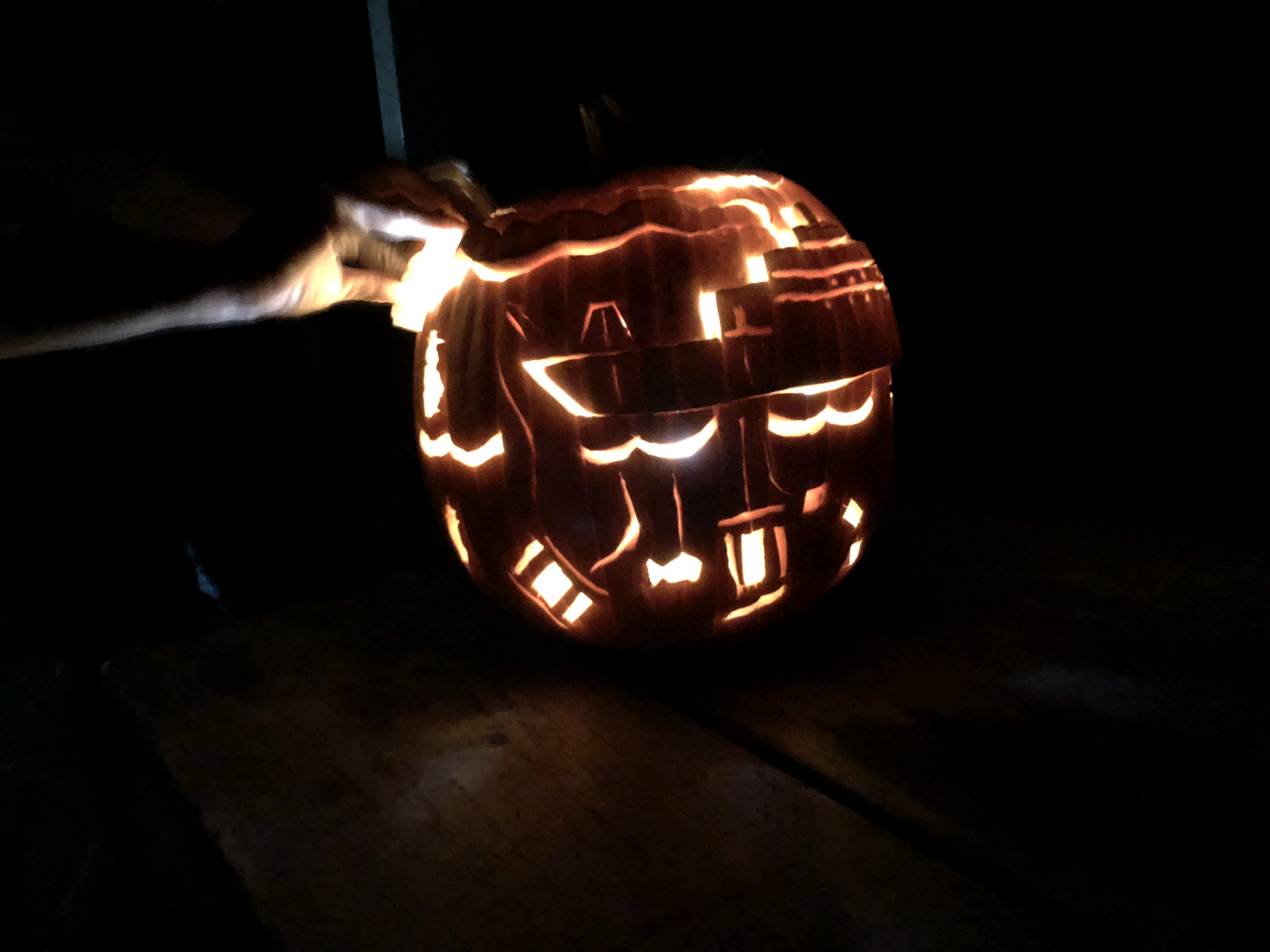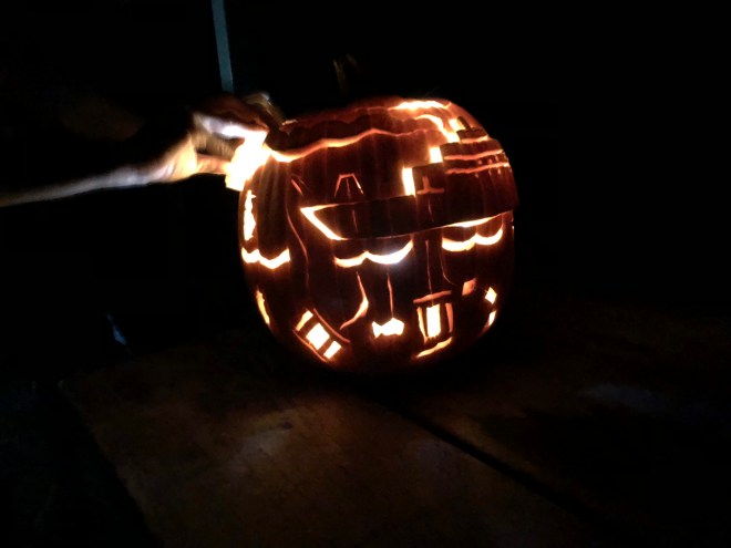 Co-chief Scientist Phoebe Lam of UCSC puts the finishing touches on her collaboration with Co-chief Scientist Karen Casciotti of Stanford University. The R/V Roger Revelle can be seen deploying all of GP15’s sampling systems in the detailed pumpkin carving.