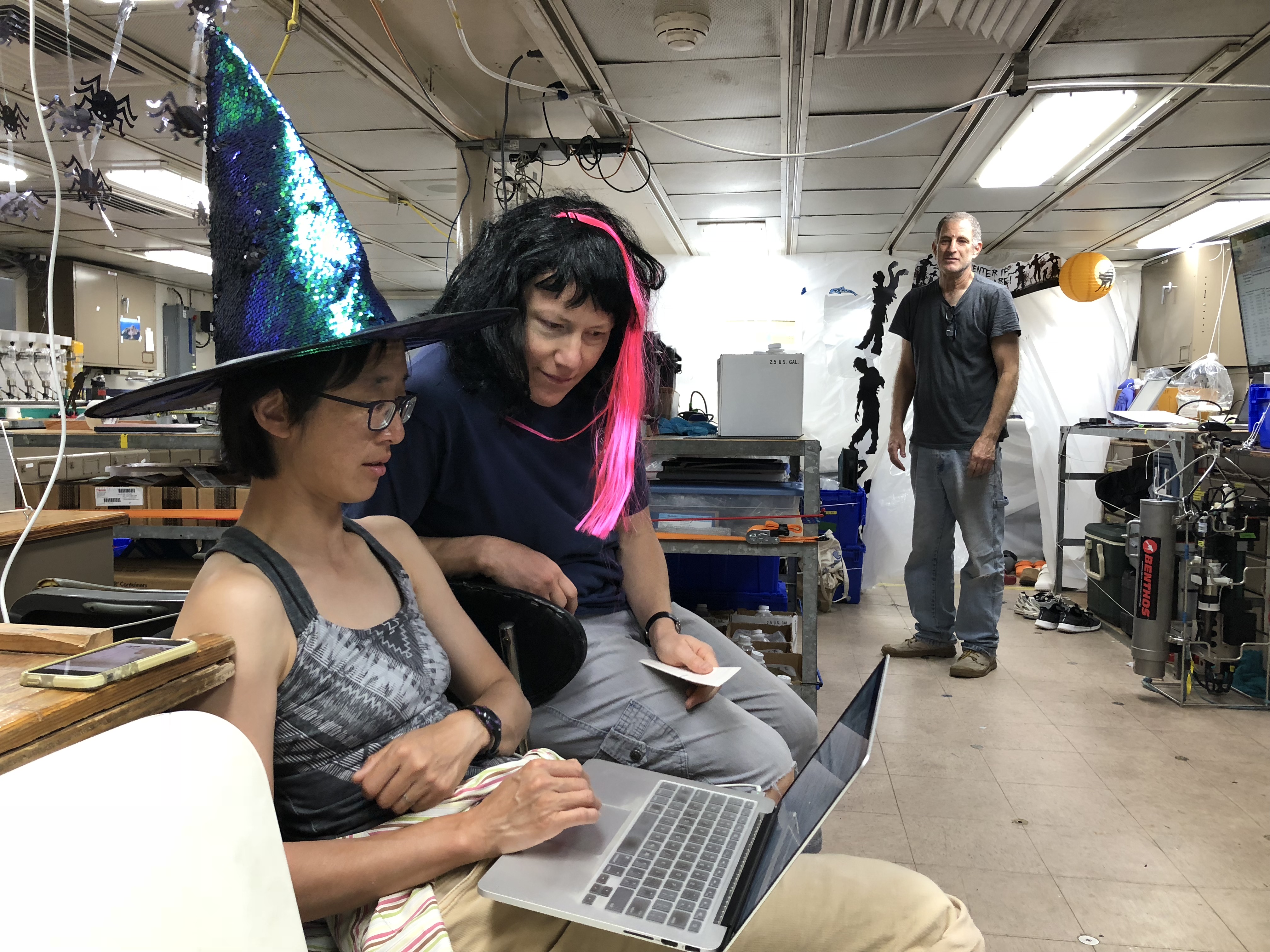 Co-chief Scientists Phoebe Lam (left) of UCSC and Karen Casciotti (right) of Stanford University working together in costume on Halloween.