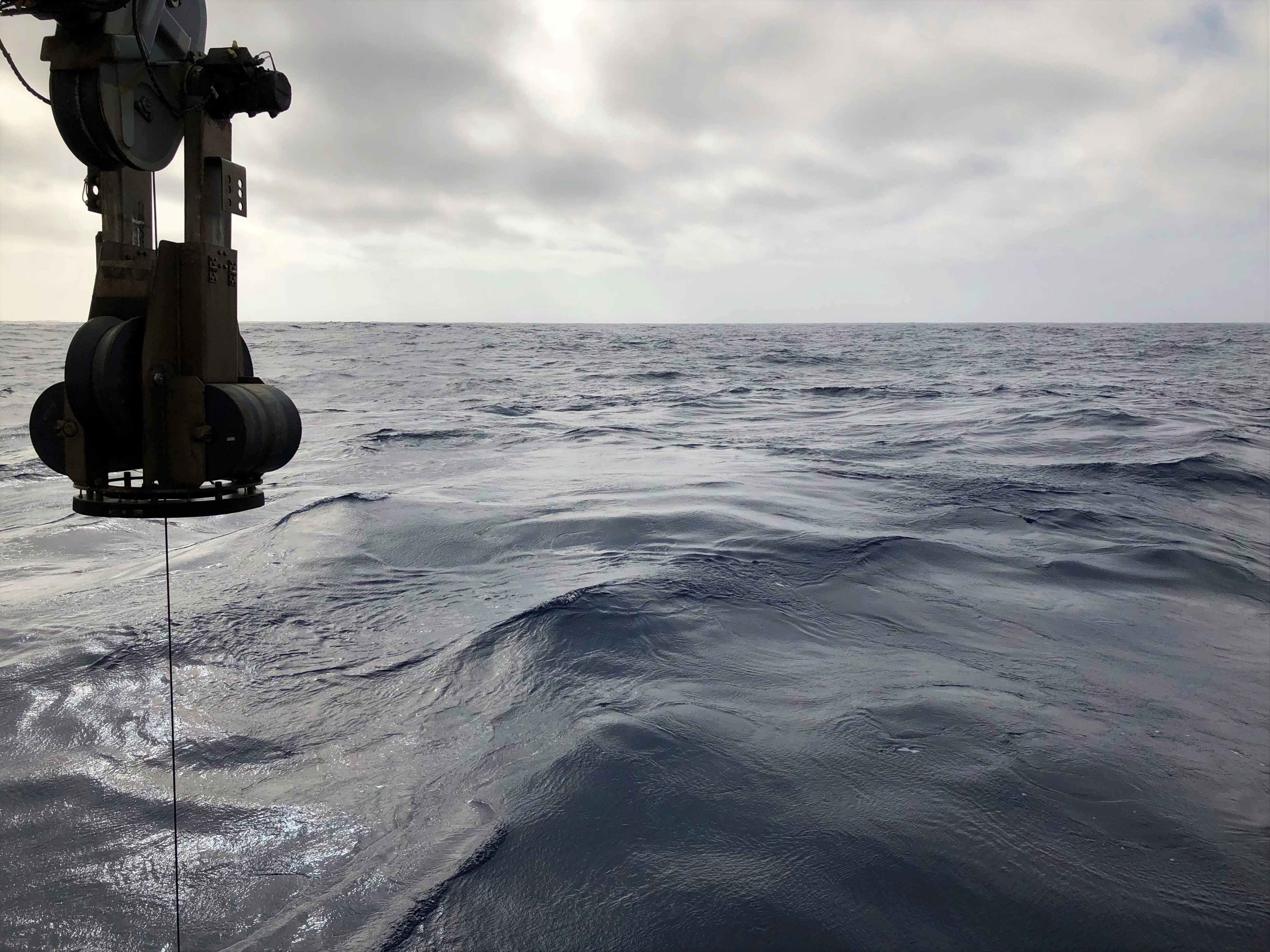 Previous ImageNext Image IMG_E4609 The R/V Roger Revelle’s winch arm lets out cable as the Pacific undulates beneath.