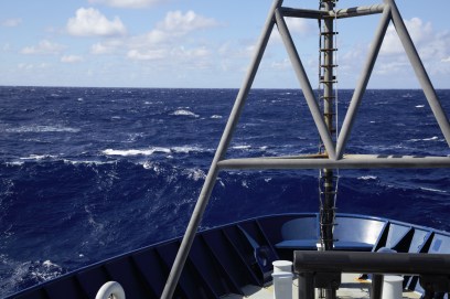 Waves rise up above the bow of the Roger Revelle.