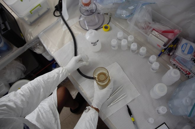 Previous ImageNext Image SciView Clifton Buck of Skidaway Institute of Oceanography works on some rainwater inside the bubble.