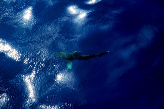An oceanic white-tip shark soars through the water on its broad pectoral fins after the Revelle has been sitting in place for more than 24-hours. As the ship’s shadow collects smaller fish seeking shelter, sharks and other predators come in to investigate. Sadly, the experienced oceanographers on board confirmed that shark sightings are much rarer now than they used to be.