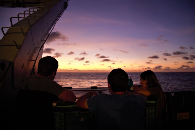 Left to right: Sveinn Einarsson of Old Dominion University, Brent Summers of the University of South Florida and Laramie Jensen of Texas A&M University take a moment to appreciate the setting sun.