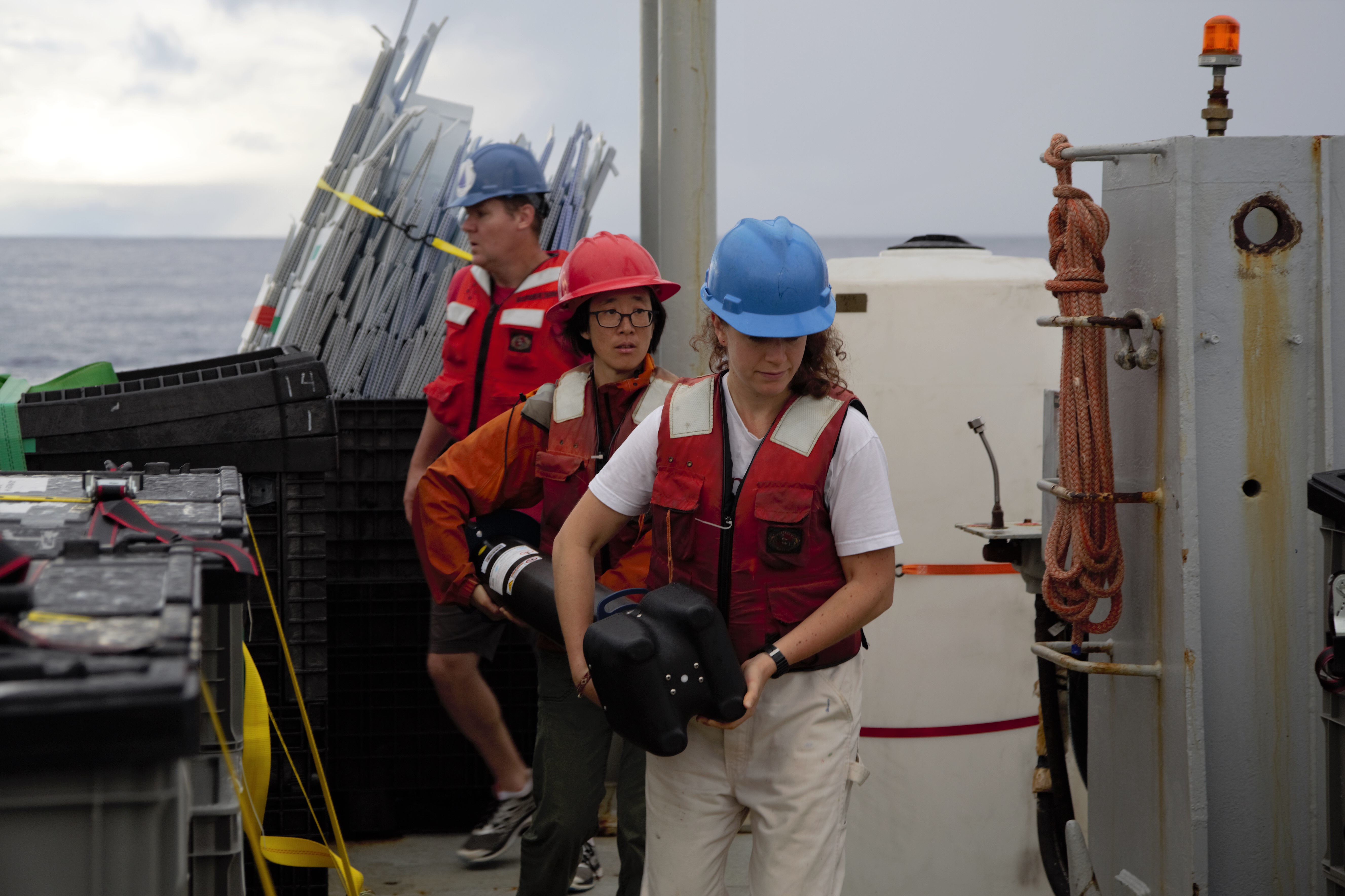 Left to right: Paul Henderson of Woods Hole Oceanographic Institute, Phoebe Lam of University of California, Santa Cruz and Colette Kelly of Stanford University carry an ARGO float. Close to 4000 of these autonomous floats record oceanographic data throughout the world’s oceans.