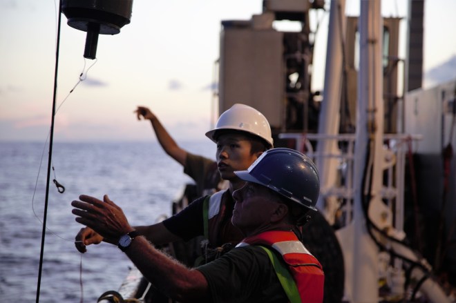 Previous Image Yang Spike retrieve Members of the pump team Steven Pike (foreground) of WHOI and Yang Xiang of UCSC prepare to grab the winch cable to retrieve their equipment.